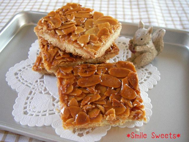 キャラメルとアーモンドスライスがからまったのが、クッキーと合わさってるお菓子!
