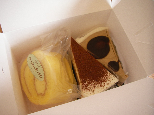 カスタードクリームのロールケーキ(左)と、カフェラテというコーヒー味のケーキ(右)と