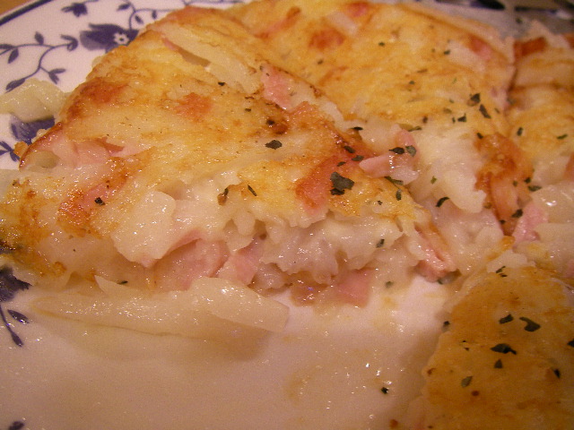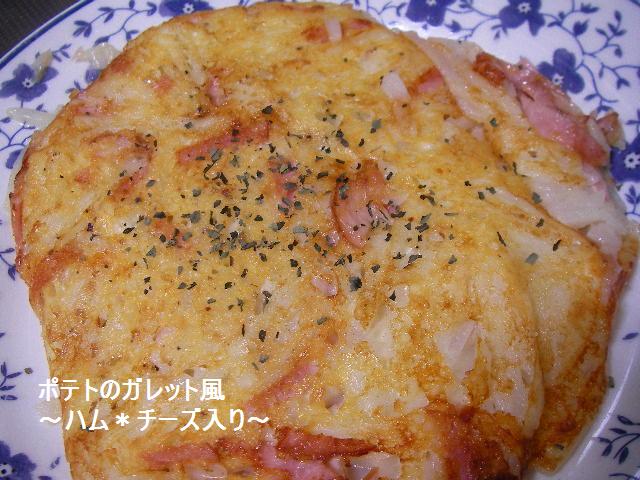 細切り(千切り?)したジャガイモ(あまり細く切ってないけど:汗)を耐熱容器に入れてレンジでチン!なんとなく火が通ったくらいになったら、バターを熱したフライパンで焼きます。細切りハムとチーズ(溶けるタイプのピザ用チーズみたいなの)を加えて、両面こんがりといい色が付くように焼きます。味付けは、軽く塩程度。ブラックペッパーとバジルで風味付け。