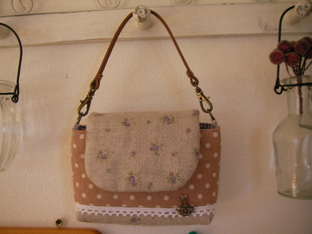 渋ピンク色のドットの綿麻生地に花柄リネンを合わせて