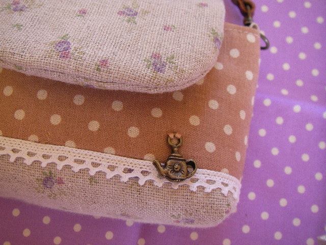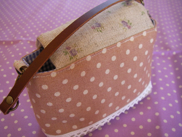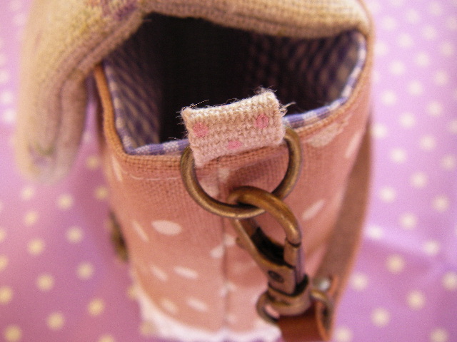 Dカンを通したテープはリネンでピンクの水玉柄です♪