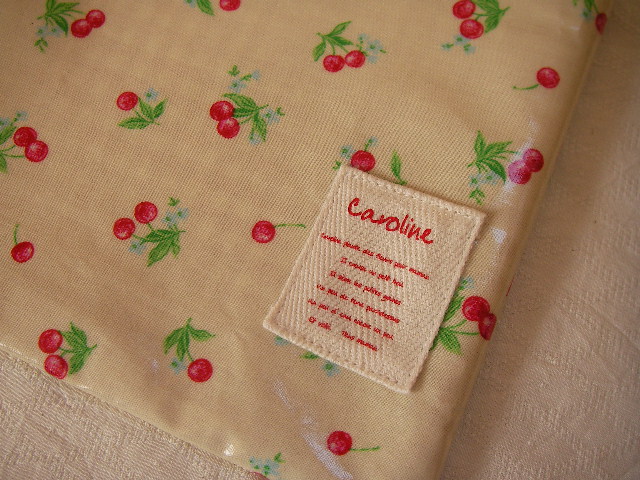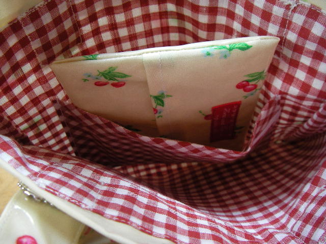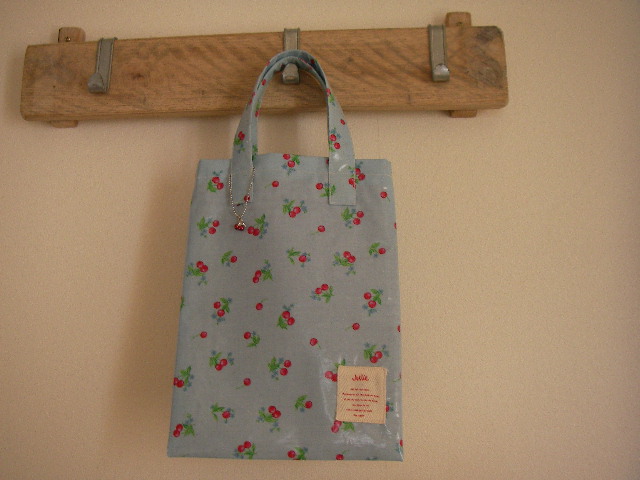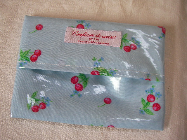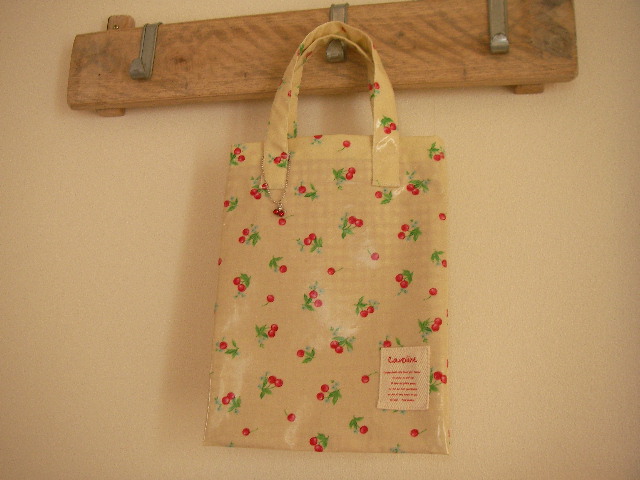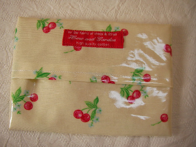 さくらんぼ柄のラミネート地で作った、ペタンコトートバッグとティッシュケースの