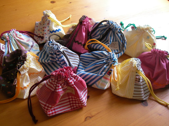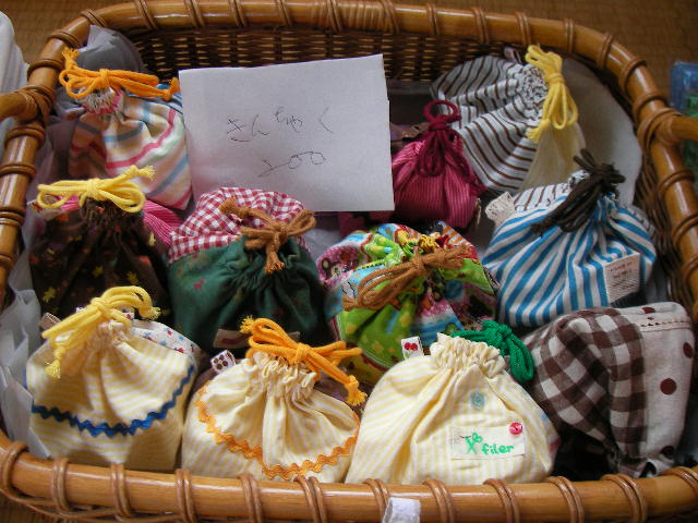 巾着・・褒めてくれてありがとう!!あがいて色々つけたりしてみたけど、どうも納得いかなくってどうしよ~~~ってカンジだったんだけど、バザー仲間がみんな気に入ってくれたので、ヨシ!ということにしちゃった**