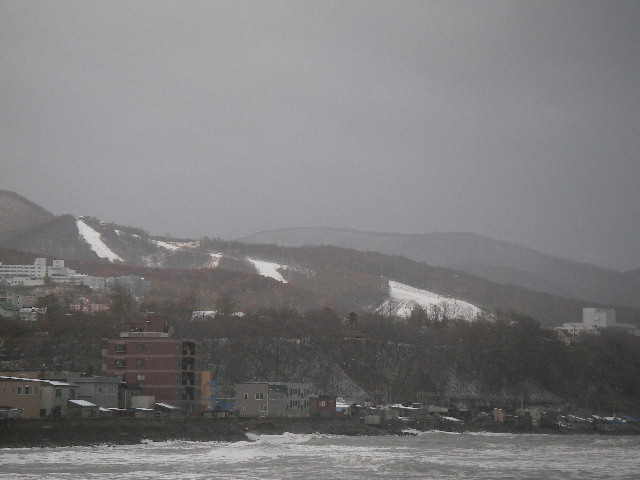 山には雪が積もっているし、海も荒れています。