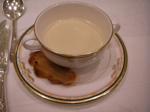 『カリフラワーのクリームスープとフォアグア風味のオニオントースト』